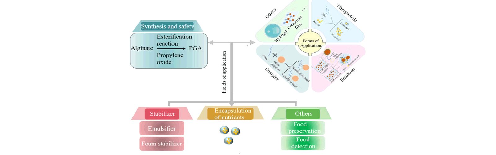 PGA becomes an acidic aqueous solution when dissolved in water. It can be dissolved even in acidic foods, resulting in thickening and stabilizing effects.It does not gel with polyvalent cations and remains stable within a pH range of 3–5. This makes it suitable as a thickener and stabilizer in foods containing calcium or acidic ingredients.